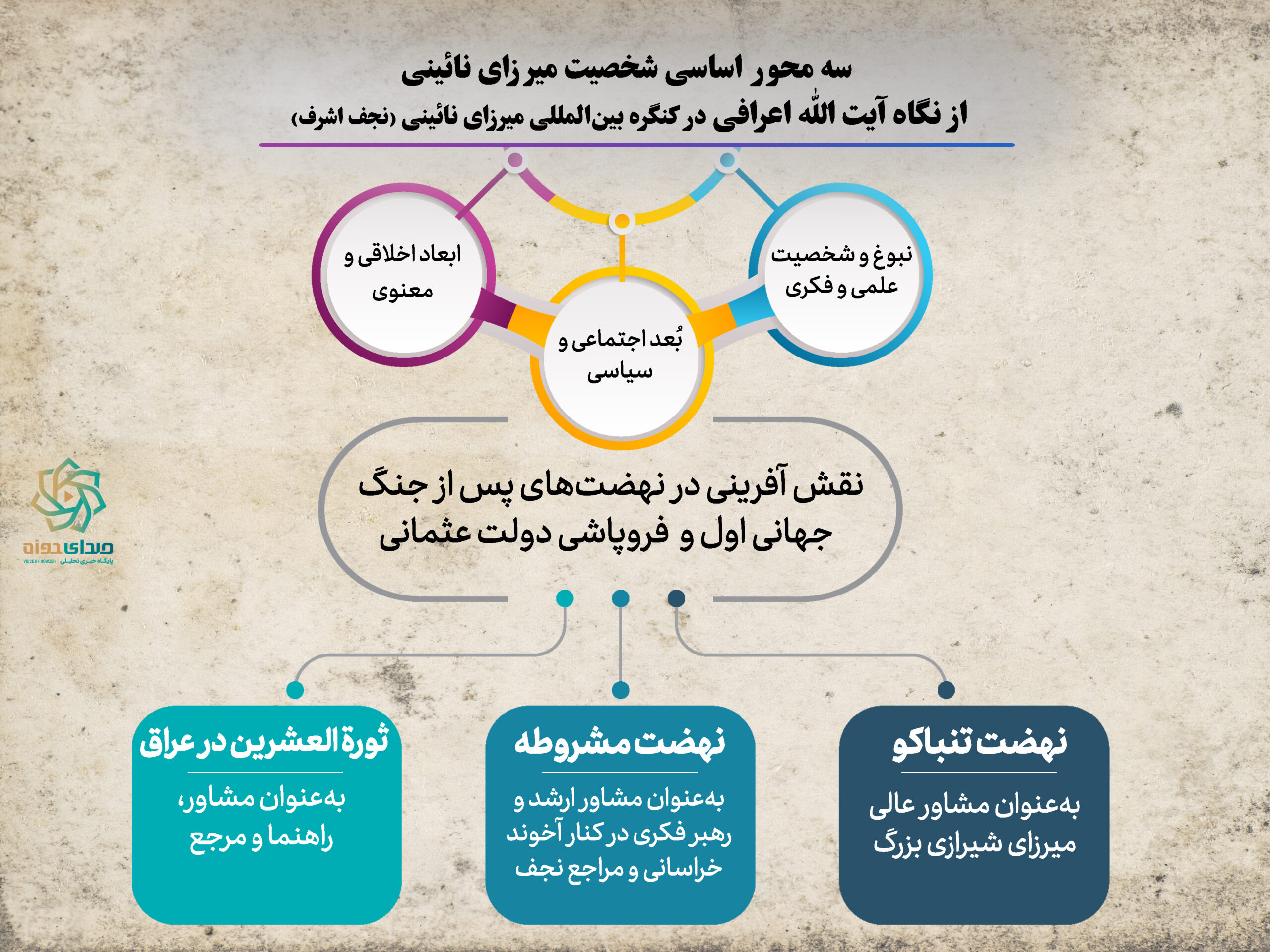۱. میرزای نائینی پس از جنگ جهانی اول در دورانی زندگی کرد که در آن دولت عثمانی فروپاشید و جهان اسلام بهطور واقعی دچار تشتت و پراکندگی شد. او بر تحولات غرب در قرن نوزدهم و بیستم میلادی آگاهی یافت، یورش اندیشههای غربی و نابسامانیهای جهان اسلام و شرایط آن را بهدرستی شناخت، و از واقعیت جهان عرب و اسلام و پیچیدگیهای آن باخبر شد. در این عرصه، این مرجع بزرگ و عالم جلیل نه راه آسایش و انزوا را برگزید، بلکه در متن میدان و مرکز نبرد قرار داشت و نقشیآفرین جدی بود. این همان سیره درخشان مرحوم میرزای نائینی است.