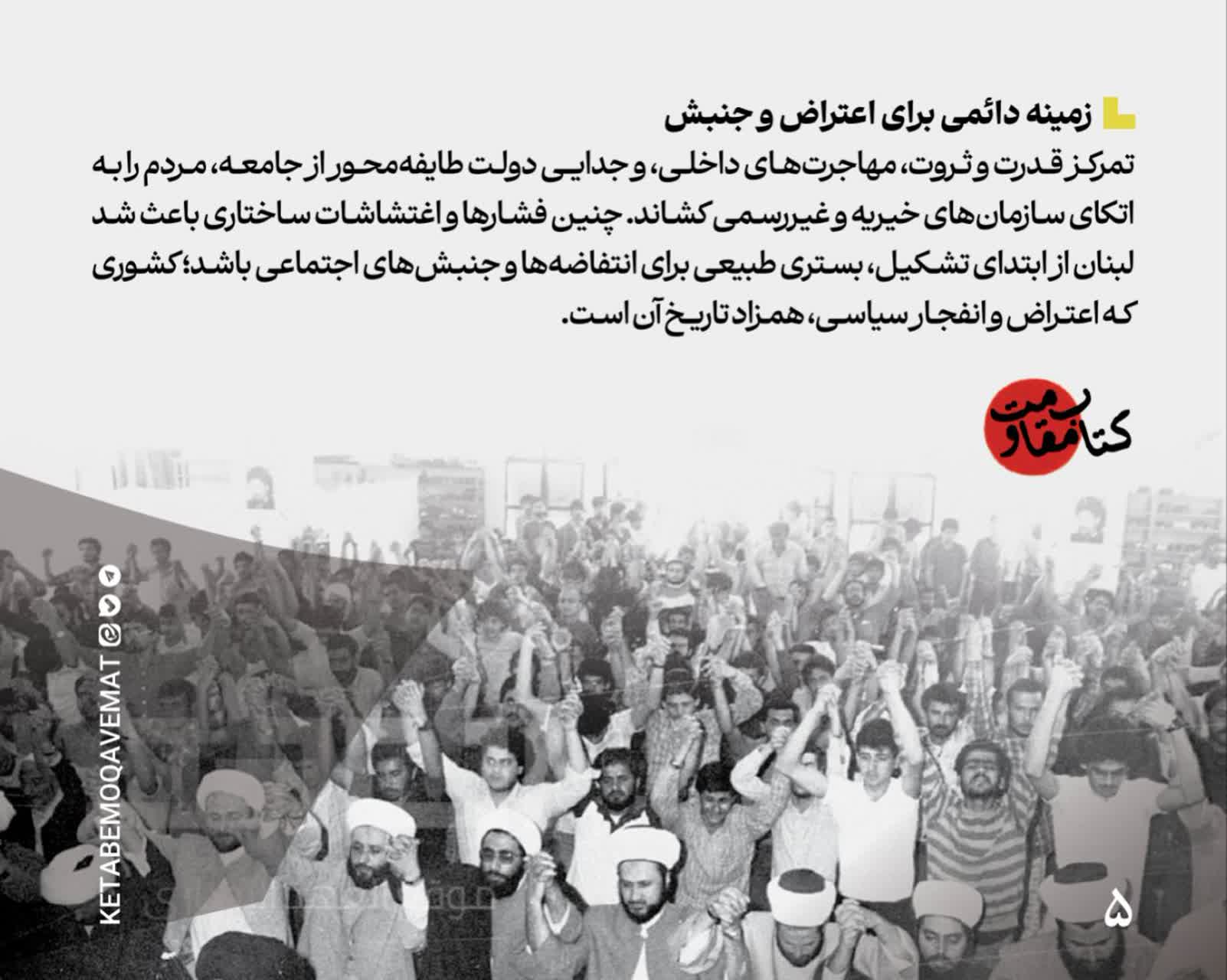 کتاب پیش‌رو، گامی مهم در حوزه «تاریخ مقاومت» و مشخصاً تاریخ تحلیلی یکی از برجسته‌ترین نمودهای آن در عصر حاضر، یعنی حزب‌الله لبنان، است. این اثر ارزشمند که حاصل پژوهش محقق اندیشمند لبنانی، جناب آقای دکتر محمد تُرمُس است، از یک پرسش بنیادین آغاز می‌شود: حزب‌الله لبنان چگونه و در چه بستری به مثابه یک جنبش دینی ظهور کرد؟ نویسنده برای پاسخ به این پرسش، روایتی صرفاً تاریخی یا سیاسی ارائه نمی‌دهد، بلکه با رویکردی جامعه‌شناختی و نگاهی معطوف به تاریخ فکری ـ اجتماعی، به کالبدشکافی زمینه‌هایی می‌پردازد که تکوین این جنبش را ممکن ساختند. این کتاب ما را به قلب جامعه شیعی لبنان در دهه‌های سرنوشت‌ساز می‌برد و نشان می‌دهد که چگونه تحولات فکری، بحران‌های سیاسی، گسست‌های اجتماعی و میراث ایدئولوژیک، دست به دست هم دادند تا پدیده‌ای به نام «مقاومت اسلامی» متولد شود.